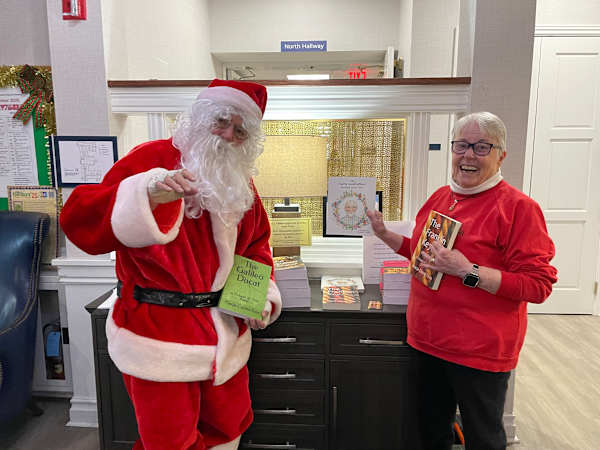 Hermes what made it extra fun: one of the residents dressed up as Santa Claus. He was there so other residents, and especially their grandchildren, could have a picture taken with “Santa”. But he gladly came to my display and let someone take a picture of the two of us. Here it is (p.s. It was a very fun day!):